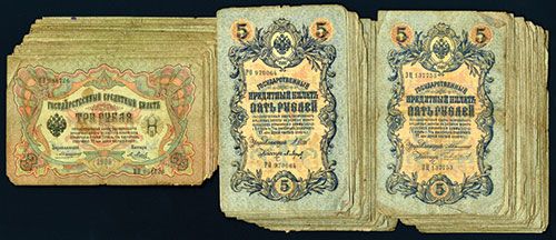 Russia, Lot of 60+ notes, Includes 22 examples of 3 Rubles, P-9b, Konshin Signature, mostly VG to Fine, some with problems; 22 Examples, 5 Rubles P-10a, Konshin signature, VG to Fine; and, 18 examples of 5 Rubles, P-10b, Shipov signatures, Good to Fine. Nice assortment with many different signature combinations.