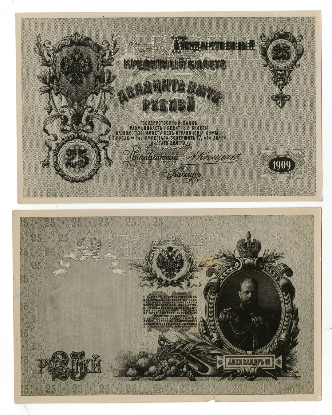 Russia, 1909-1912. 25 Rubles, P-12a, Front and Back Photo Proofs, Black and white printed on matte photo paper with portrait of Alexander III at right. VF-XF condition. This photo proof of the original design by a Russian printer was used as a reference for possible designs by TDLR. These were from the Thomas De La Rue production and design department archives..