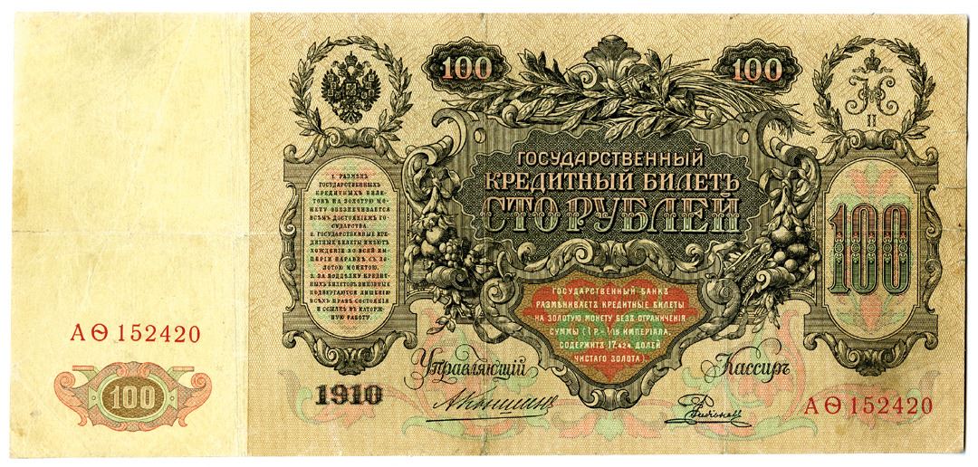 Russia. 1910. 100 Rubles, P-13a, Issued banknote, Dark brown on light brown and multicolor underprint, Sign. Konshin, Watermark: Catherine II, VF to Choice VF condition.