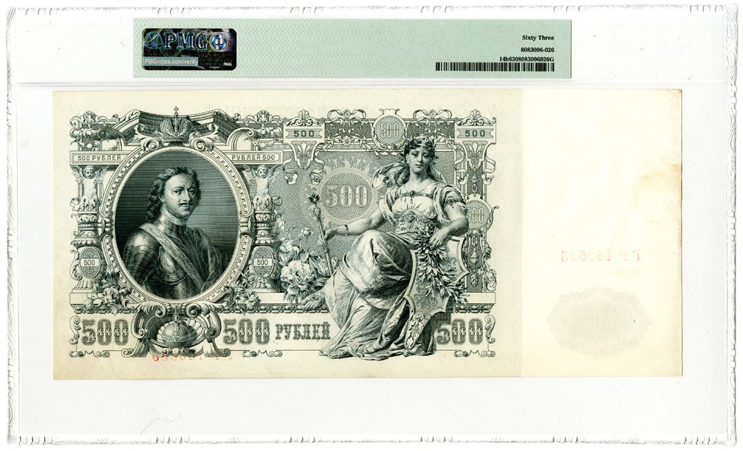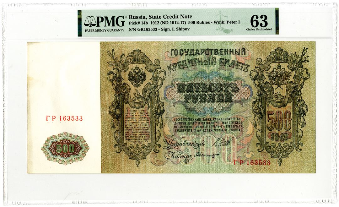 Russia. 1912 (ND 1912-17). 500 Rubles, P-14b, Issued Banknote, S/N GR163533, Watermark: Peter I, Sign. I. Shipov, PMG graded Choice Uncirculated 63.