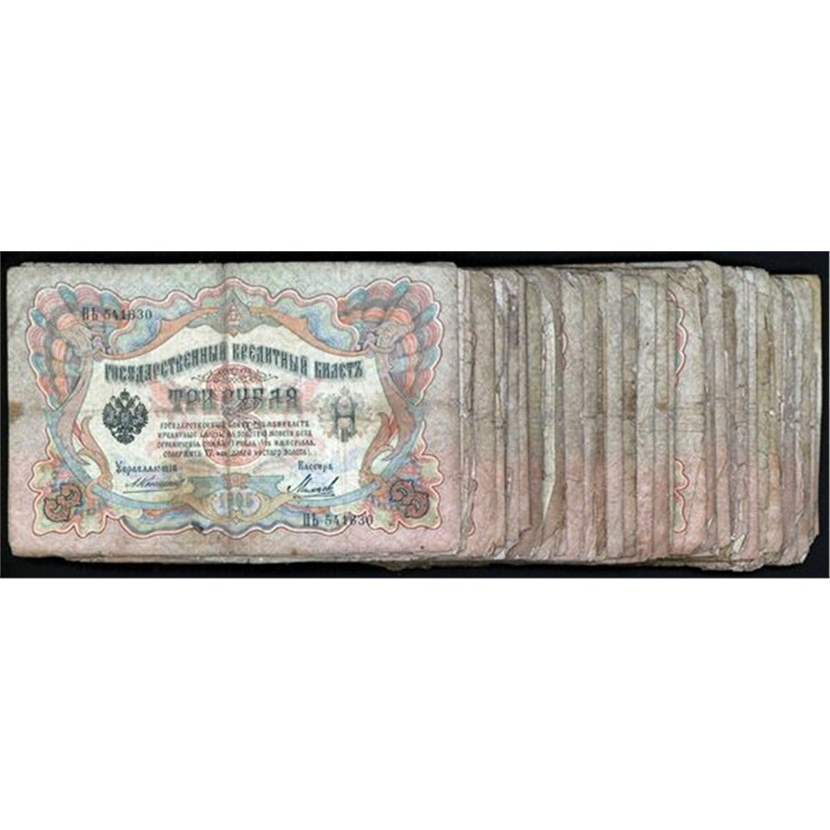 Russia, 1905-12, Lot of 75+ notes, all are 3 Rubles, P-9b, Konshin signed, condition varies between good with problems to Choice Fine condition.