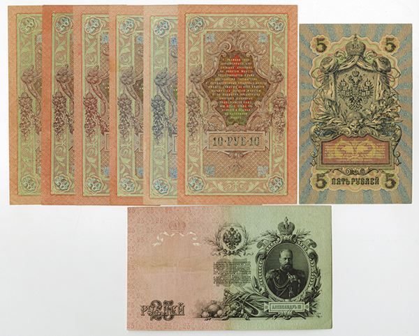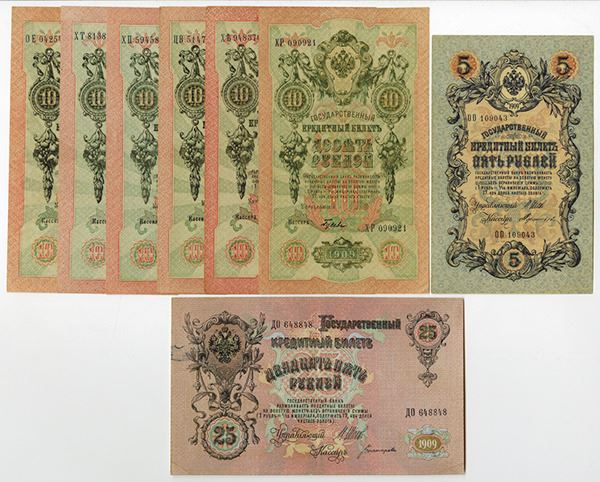 Russia. Octet of issued notes, includes 5 Rubles, 10 Rubles (6 pcs) all with diff. cashier signatures), and 25 Rubles. P-10b, 11c, 12b. Very Fine to Almost Uncirculated. (Arthur C. Matz Collection)