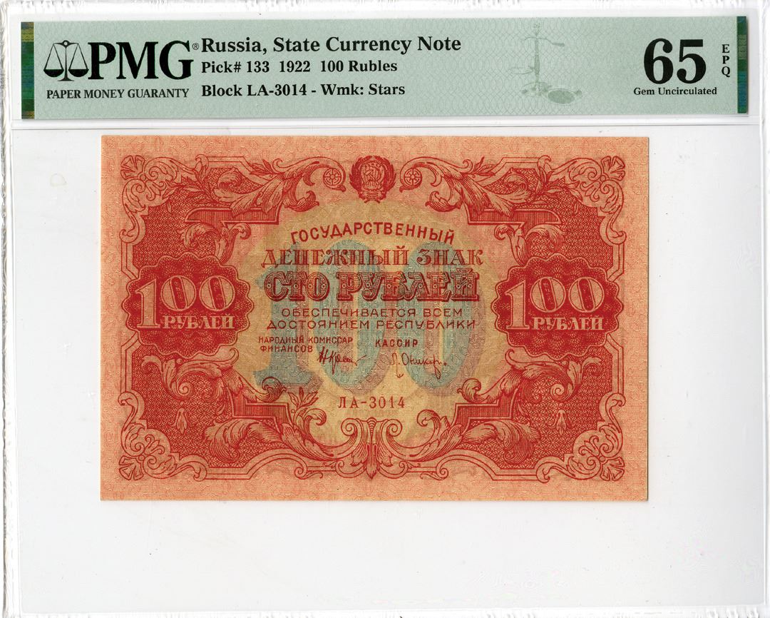 Russia, 1922. 100 Rubles, P-133, Issued Banknote, red on blue underprint with state emblem, Block LA-3014, PMG graded Gem Uncirculated 65 EPQ.