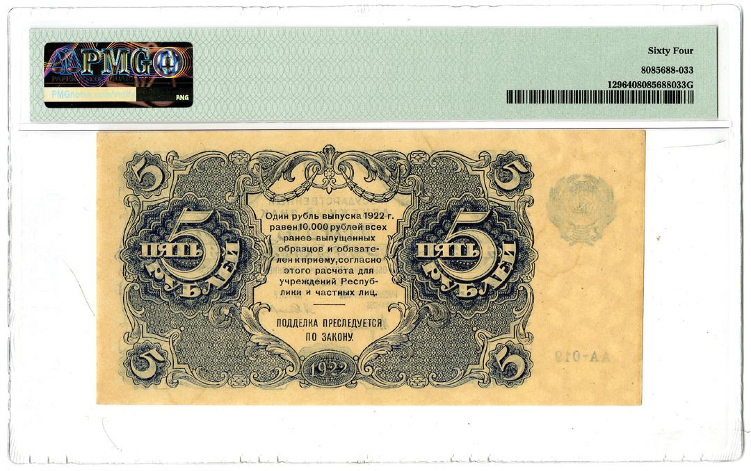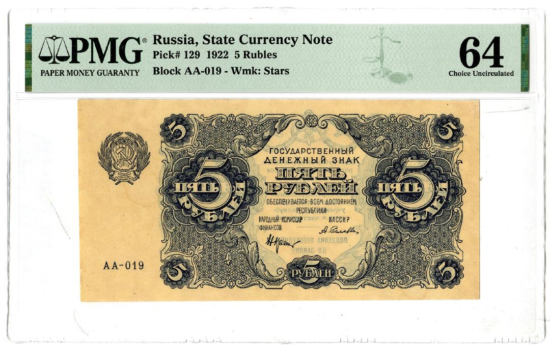 Russia. 1922. 5 Rubles, P-129, Issued banknote, Blue on face, Block AA-019, Watermark: Stars, PMG graded Choice Uncirculated 64. This is the second highest graded out of 9 in the PMG census.
