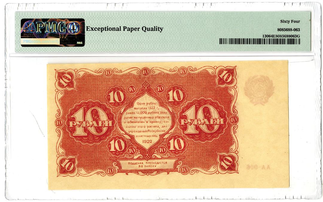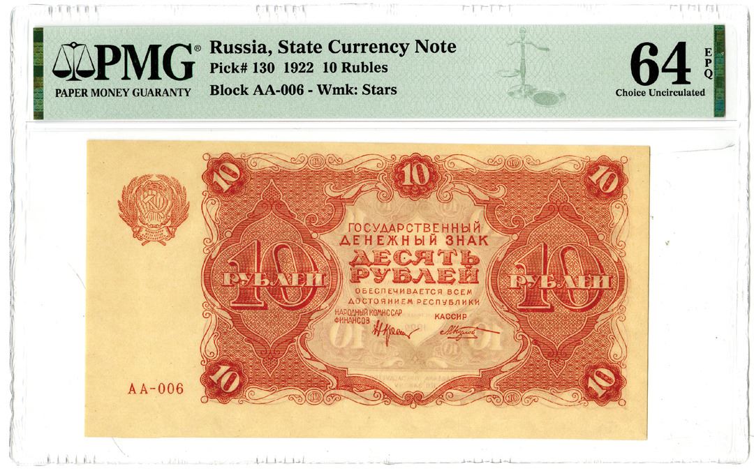 Russia. 1922. 10 Rubles, P-130, Issued banknote, Red with arms at upper left, Block AA-006, Watermark: Stars, PMG graded Choice Uncirculated 64 EPQ.