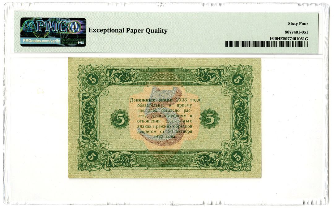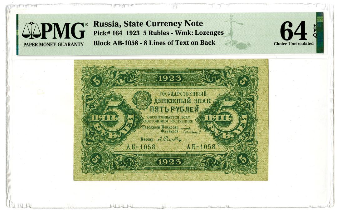 Russia. 1923. 5 Rubles, P-164, issued banknote, 8 lines of text on back, Block AB-1058, PMG Graded Choice Uncirculated 64 EPQ.