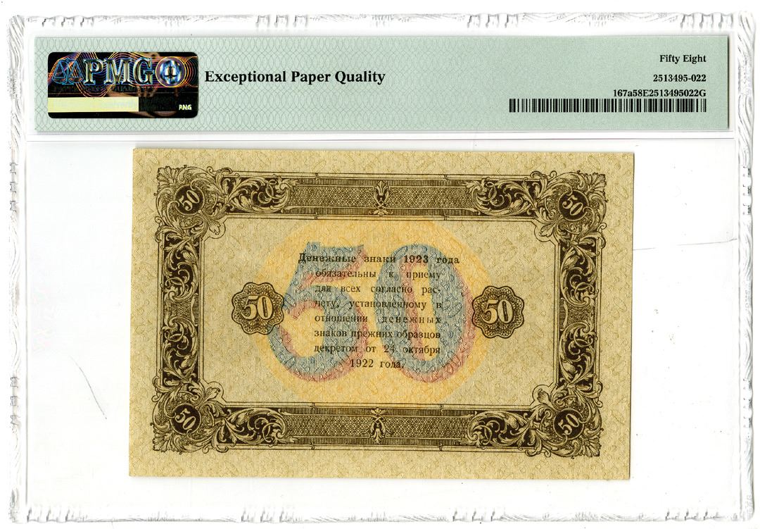 Russia, 1923. 50 Rubles, P-167a, Issued Banknote. Brown on brown paper with watermark of Lozenges. Block AD-4092. PMG graded Choice About Uncirculated 58 EPQ.