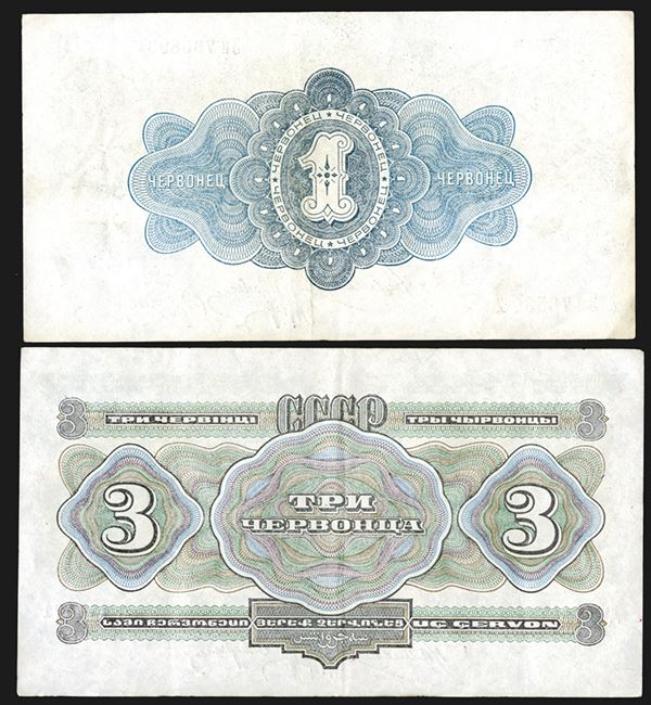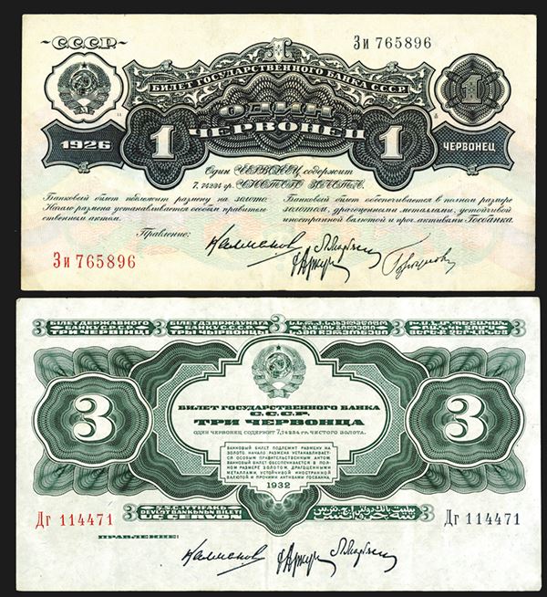 Russia, Lot of 2 notes, Includes 1926, 1 Chervonetz, P-198c, VF to Choice VF with crisp firm paper and 1932, 3 Chervontsa, P-201 a, Choice VF to XF attractive pair of notes.