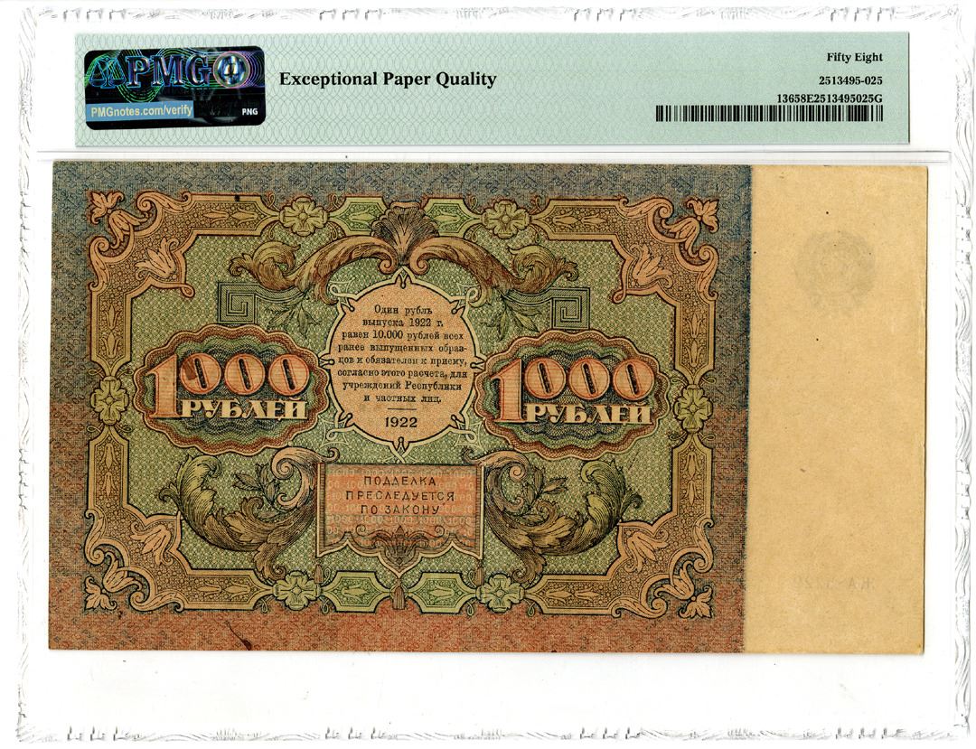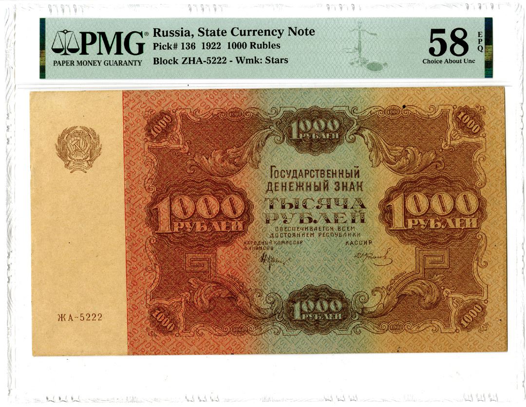 Russia, 1922. 1000 Rubles, P-136, Issued Banknote. Brown, blue, and red print. Block ZHA-5222. Watermark of stars. PMG graded Choice About Uncirculated 58 EPQ. We sold a previous example at this grade in November of 2021 for $354. This lovely note is equally attractive.