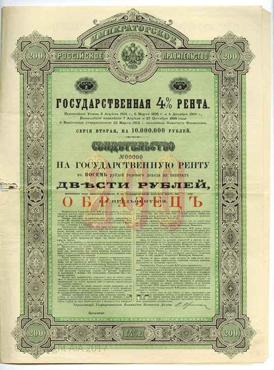 Imperial Russian Government, 1902, specimen 200 Ruble 4% bond, large format bifold with coupons attached, series 2 serial 00000, overprinted "________" in red (Russian for specimen), double headed eagle at top center of ornate frame, green, text in Russian, French, and German. Choice Very Fine.
