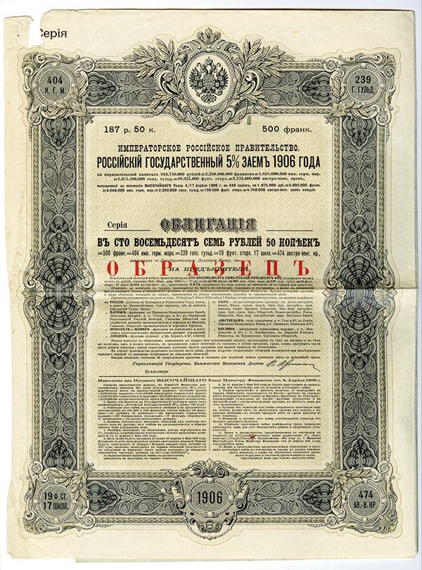 Imperial Russian Government, 1906, specimen 187 Ruble 70 Kopek 5% bond, large format bifold with coupons attached, series __ and no serial, overprinted "________" in red (Russian for specimen), double headed eagle at top center of ornate frame, tan, text in Russian, French, German, and English. Very Fine with margin tears.