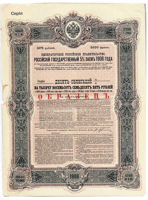Imperial Russian Government, 1906, specimen 1875 Ruble 5% bond, large format bifold with coupons attached, series __ and no serial, overprinted "________" in red (Russian for specimen), double headed eagle at top center of ornate frame, pink, text in Russian, French, German, and English. Very Fine with margin tears and minor stains.