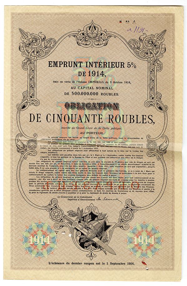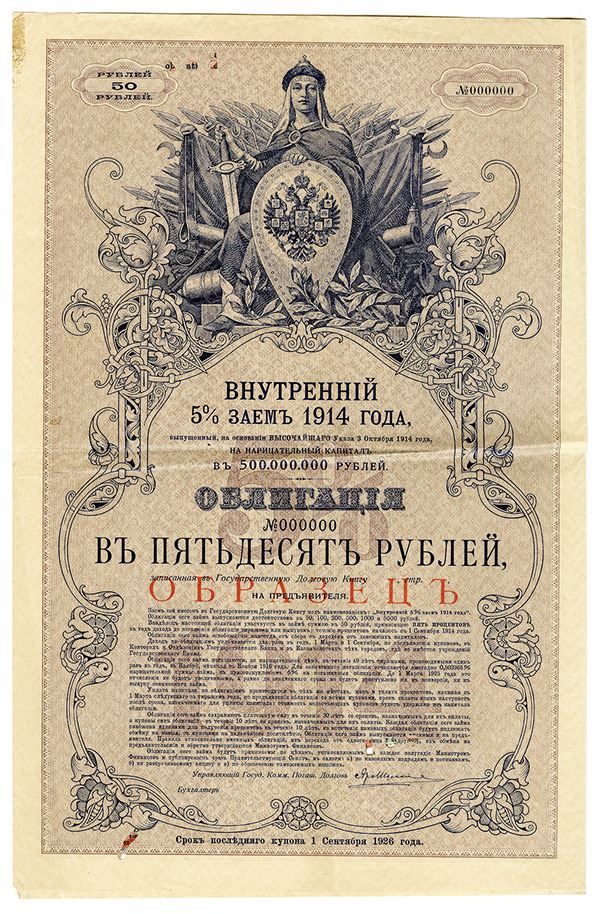 Imperial Russia, 1914, specimen 50 Ruble 5% internal government bond, large format bifold with coupons attached, serial 000000, overprinted "________" in red (Russian for specimen), allegorical mother Russia holding sword and shield with double headed eagle at top center of ornate frame, purple, text in Russian and French. Choice Very Fine.