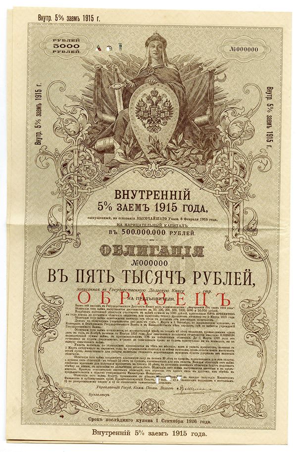 Imperial Russia, 1915, specimen 5000 Ruble 5% internal government bond, large format bifold with coupons attached, serial 000000, overprinted "________" in red (Russian for specimen), allegorical mother Russia holding sword and shield with double headed eagle at top center of ornate frame, pale green, text in Russian and French. Extra Fine.
