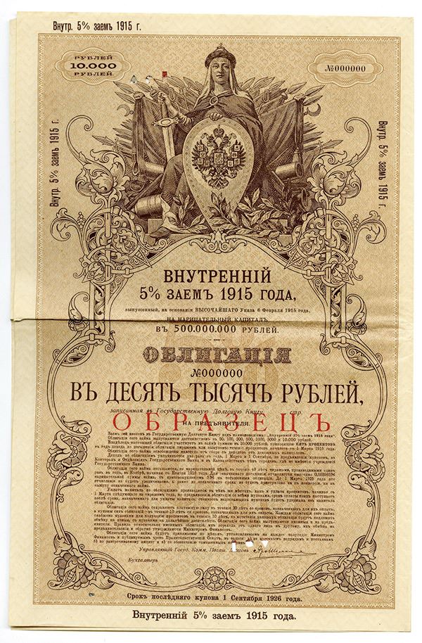Imperial Russia, 1915, specimen 10000 Ruble 5% internal government bond, large format bifold with coupons attached, serial 000000, overprinted "________" in red (Russian for specimen), allegorical mother Russia holding sword and shield with double headed eagle at top center of ornate frame, brown, text in Russian and French. Extra Fine.