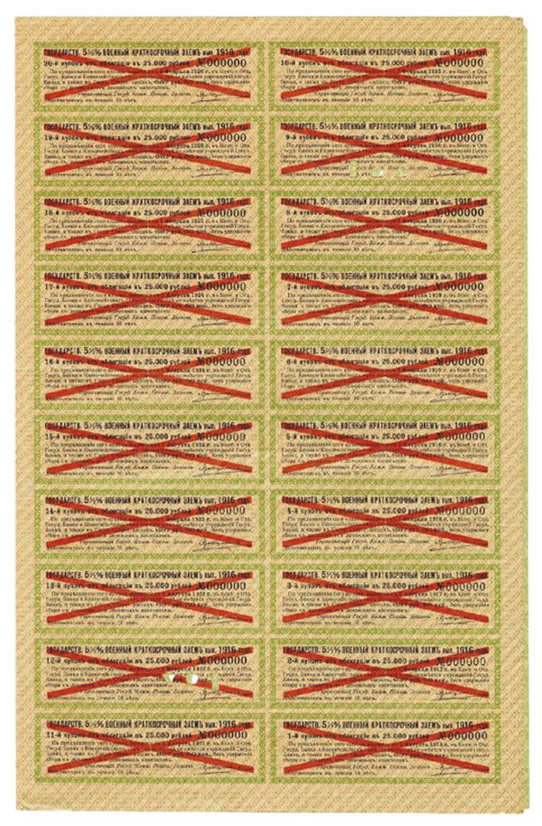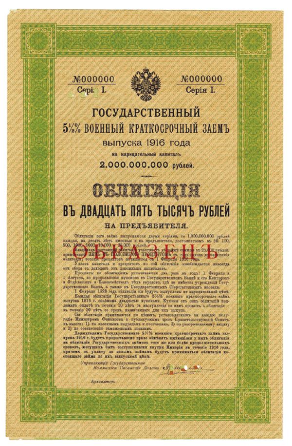 Imperial Russia, 1916, specimen 25000 Ruble 5.5% short-term military bond, bifold with coupons attached, series I, serial 000000, overprinted "________" in red (Russian for specimen), double headed eagle at top center ornate light green frame, text in Russian. Uncirculated.