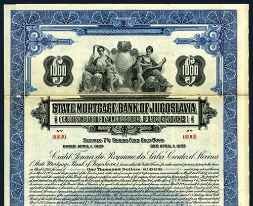Yugoslavia, 1927, $1000, Secured 7% Sinking Fund Gold Specimen Bond, Vertical format, POC's , VF condition with some splitting along creases, ABNC.
