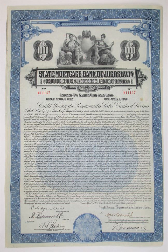 State Mortgage Bank of Yugoslavia, 1927, I/U U.S. Dollar Denominated Gold Coupon Bond Pair