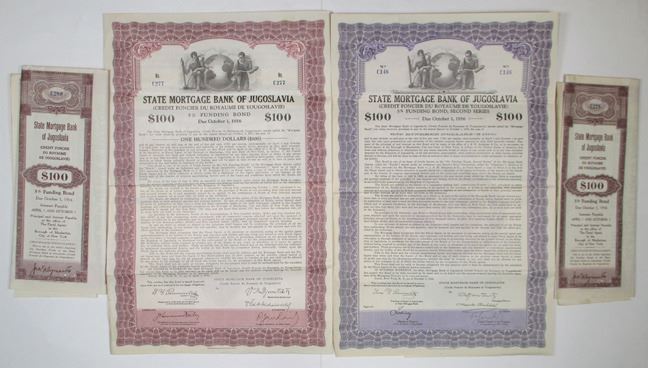 Yugoslavia, 1933-36. Lot of 4, $100 I/U 5% Coupon Bonds, 1 with a purple border, and the rest with pink/brown border, All are in VF-XF condition, HBNC. (4). Sold "AS IS" no returns accepted.