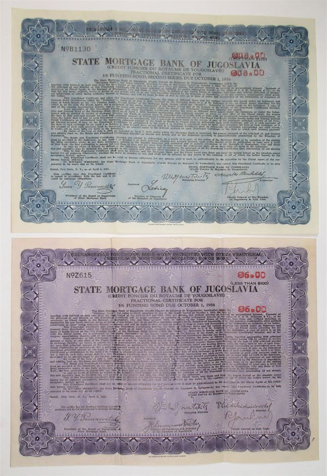 Yugoslavia, 1935-37. Lot of 2, I/U Bonds, Includes: $6 5% Funding Bond with purple border and underprint; $8 5% Funding Bond with blue border and underprint, Pieces are in Fine-VF condition. HBNC. (2). Sold "AS IS" no returns accepted.