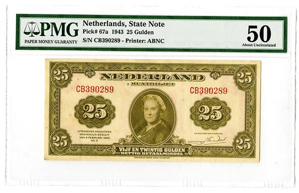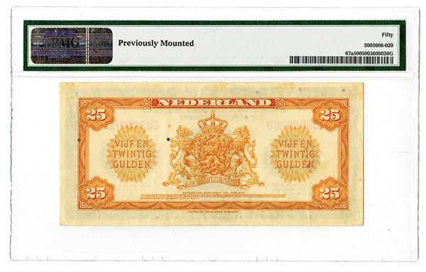 Netherlands. Issued 25 Gulden, 1943, P-67a. PMG graded About Unc 50 with comment "Previously Mounted" (Cert # 5003608-020). ABNC.