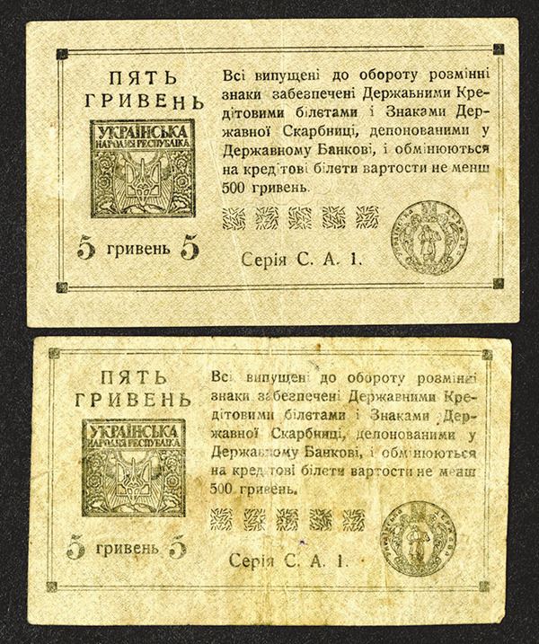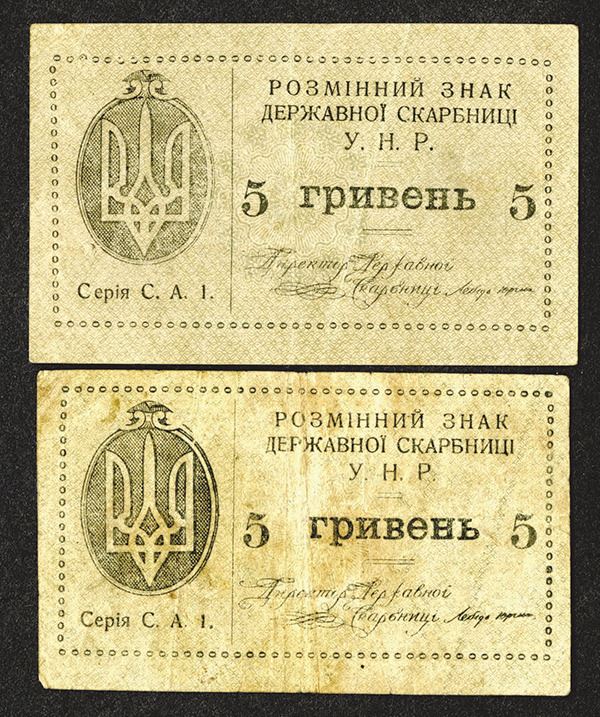 Ukraine. 5 Hryven. P-41a (2). Trident at left. Both Fine with the appearance of better. 2 pieces. (The Pogrebetsky Family Archives)