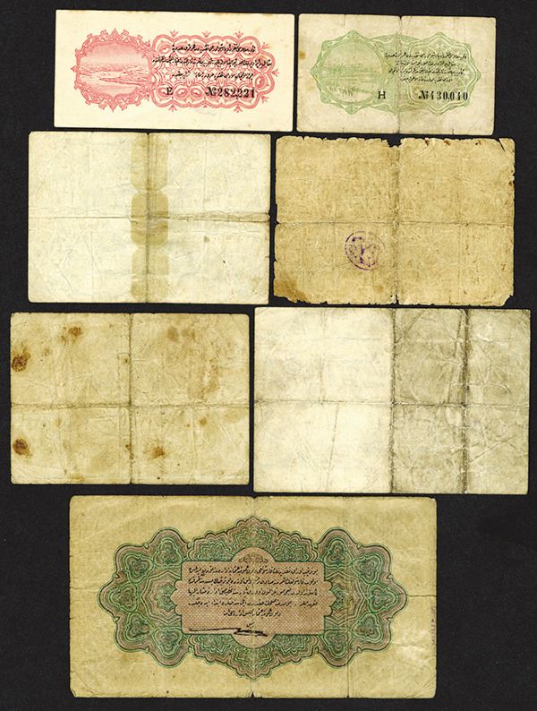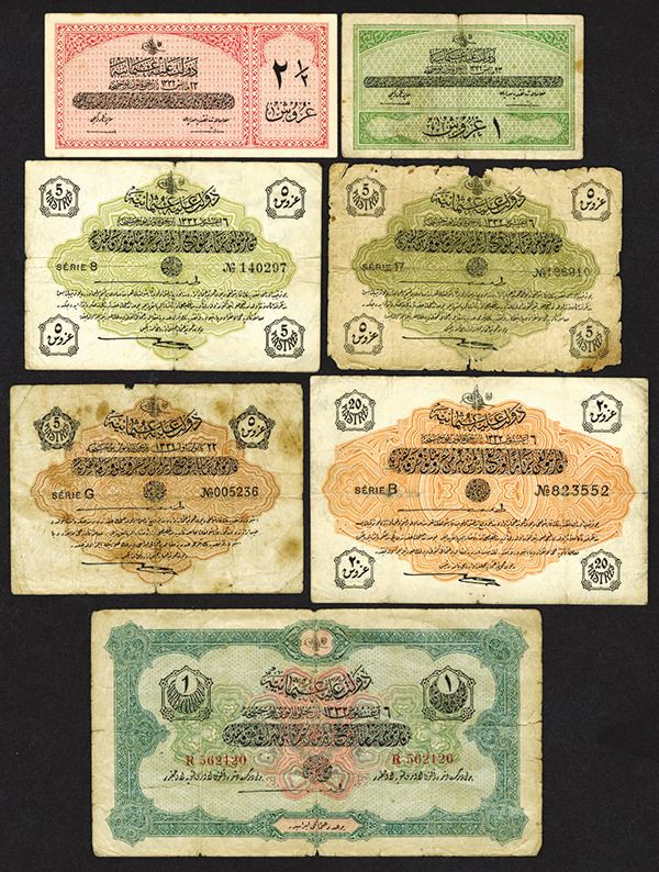 Turkey. 5 Piastres. P-79a. Fine, stains; 1, 2-1/2 Piastres P-85, 86. Fine, Very Fine; 5, 20 Piastres, 1 Livre. P-87 (2, hinge repair on back of one), 88, 90b. Mostly Very Good to Fine. 7 pieces.