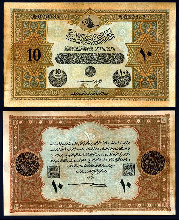 Turkey, AH 1334 (1918), 10 Livres, P-110X, Thought to be a British counterfeit, Issued banknote, 2 eme Emission, With watermark, Numeral "10's" face out on left margin, AU-Uncirculated condition with firm paper, well centered and large margins with toning on the left and right borders, Scarce large size note.