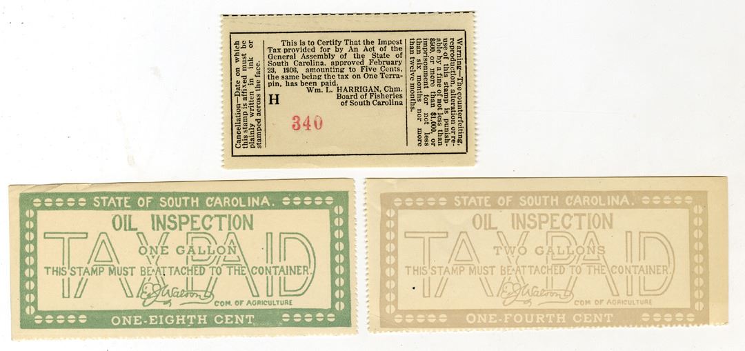 South Carolina.....,.., Lot of 3 stamps, Includes: Terrapin, Impost Tax, Act of Feb. 23, 1906 amounting to 5 Cents tax on One Terrapin, Unused, S/N 340, Rare; and, 2 examples of Oil Inspection Tax Paid for 1 Gallon at 1/8th Cent and 2 Gallons at 1/4 Cent, both mint, the 1 Gallon Unhinged. (3)