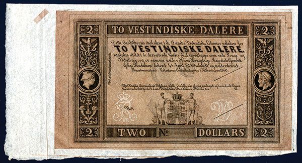 Danish West Indies, 18xx (1860), $2, P-7, Remainder, Black on light brown undertint on parchment type paper, Mercury and Zeus portraits on left and right, arms in middle, back with numeral, No serial numbers, Choice XF to AU condition with handling on the right margin keeping this scarce note from Uncirculated, the 1898 issue is a lot more common.