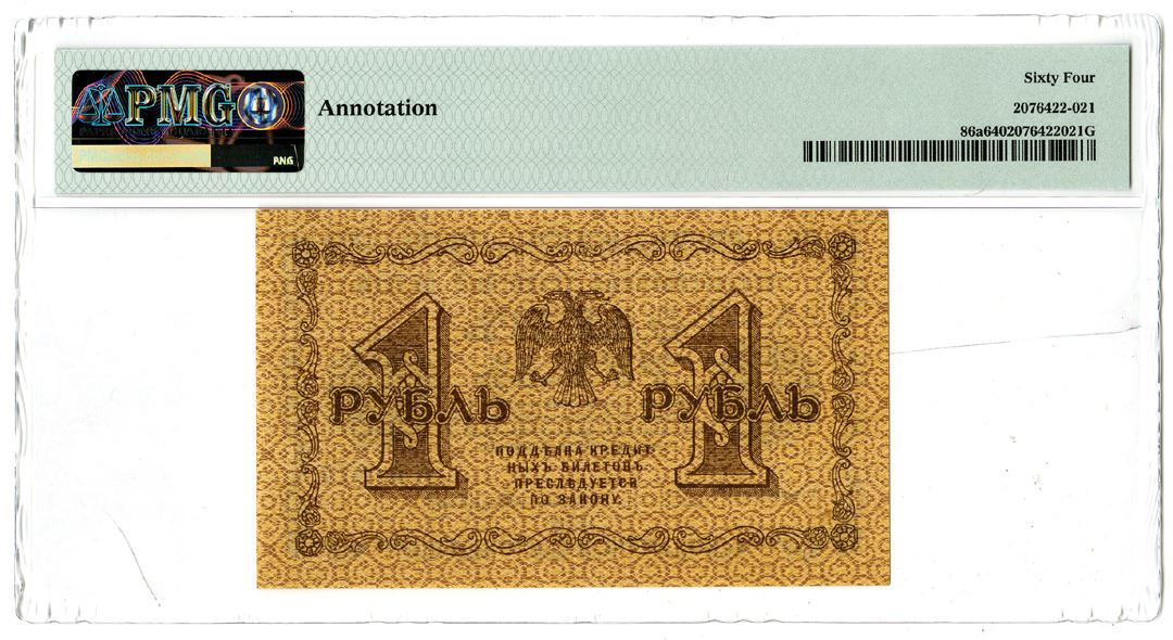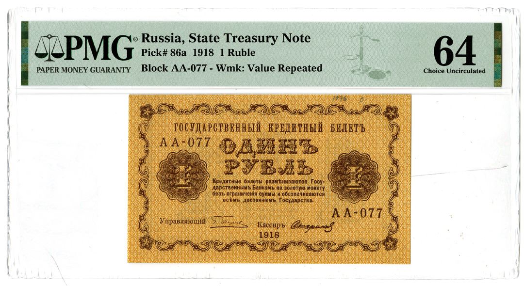 Russia. 1918. 1 Ruble, P-86a, Issued banknote, Brown on tan underprint, Block AA-077, Watermark: Value Repeated, PMG graded Choice Uncirculated 64 with comment "Annotation."