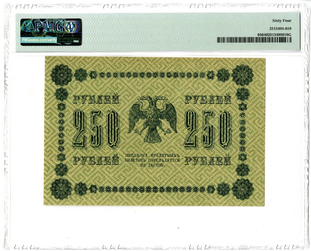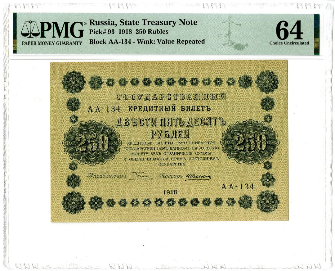 Russia, 1918. 250 Rubles, P-93, Issued Banknote. Dark green on light green. Block AA-134. Watermark is the value repeated. PMG graded Choice Uncirculated 64.