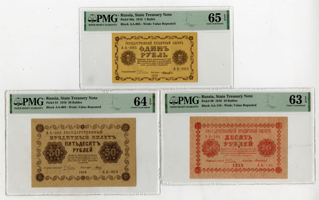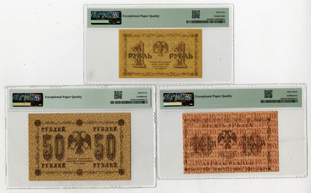 Russia, 1918. Lot of 3 Issued Banknotes, Includes: 1 Ruble, P-86a, Brown on tan underprint with Double Headed eagle on back, Block AA-085, PMG Gem Unc 65 EPQ; 10 Rubles, P-89, Red-brown on light red underprint with Double Headed eagle on back, Block AA-144, PMG Choice Unc 63 EPQ; 50 Rubles, P-91, Dark brown on light brown underprint with Double Headed eagle on back, Block AA-003, PMG Choice Unc 64 EPQ. (3). Sold "AS IS" no returns accepted.