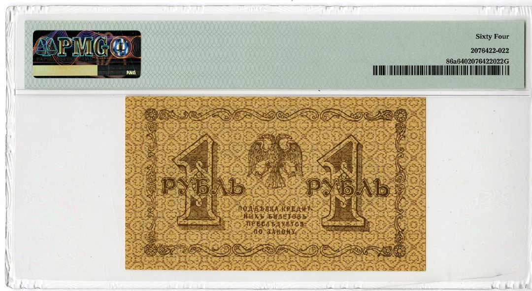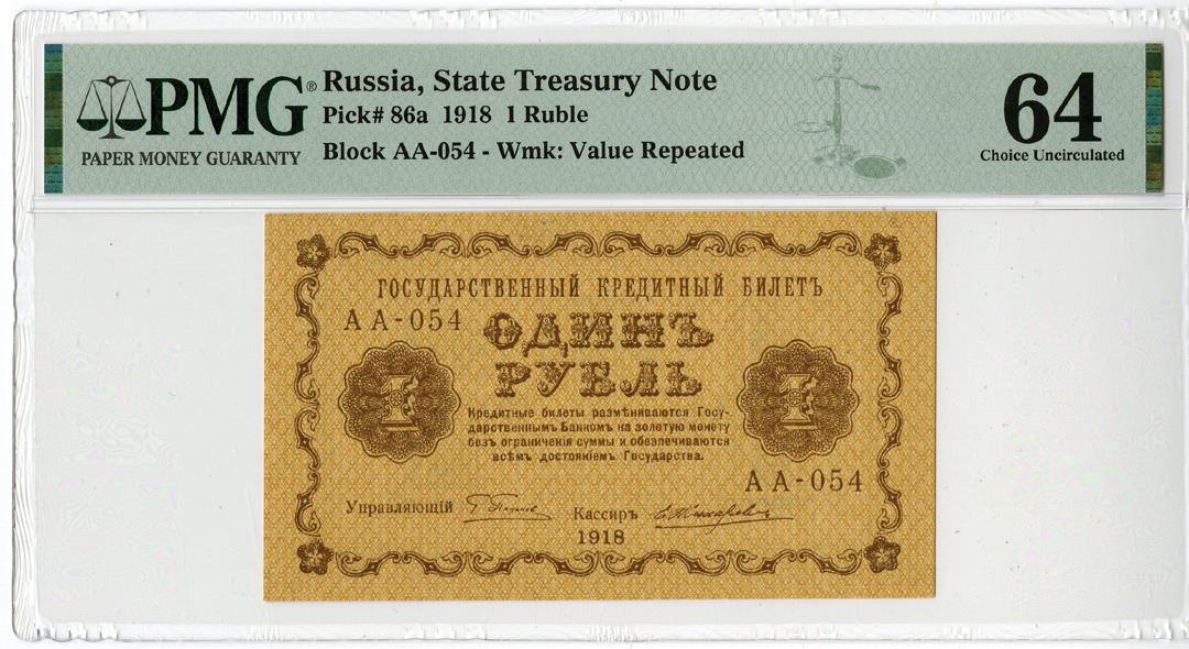 Russia, 1918. 1 Ruble, P-86a, Issued banknote, Brown on light brown underprint, Block AA-054, Watermark: Value Repeated, PMG graded Choice Uncirculated 64.