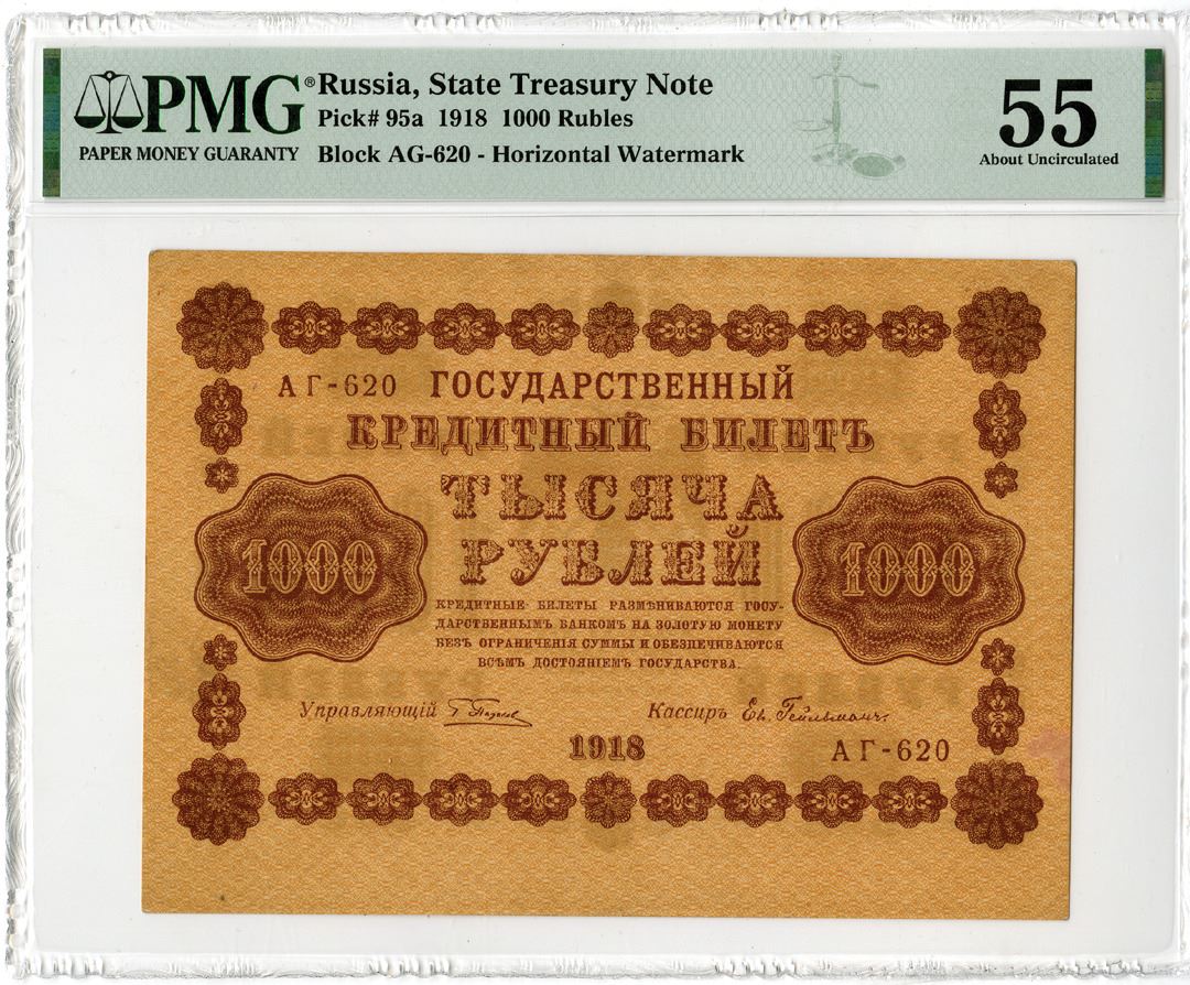 Russia, 1918. 1000 Rubles, P-95a, Issued banknote, Brown on light brown underprint, Block AG-620, Horizontal Watermark, PMG graded About Uncirculated 55.