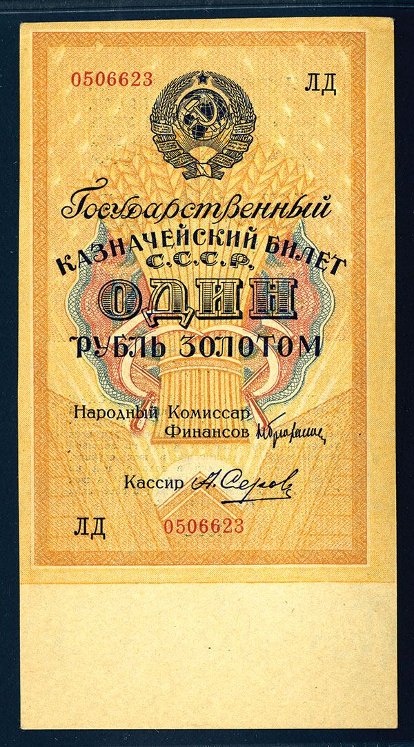 Russia, 1928, 1 Gold Ruble, P-206, Issued banknote Both are issued banknotes. Blue on light brown and m/c undertint with arms upper center, back black on light brown. PMG graded Choice Uncirculated 64 EPQ, Scarce note in high grade. Only nine graded by PMG, this example tied for finest known.