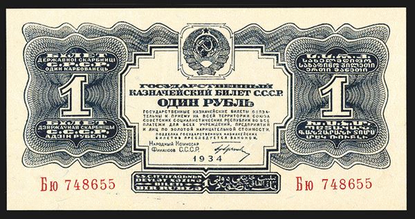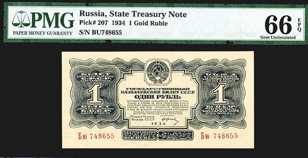 Russia. 1934, 1 Gold Ruble, P-207, Issued banknote, black on light orange underprint, S/N's 748655, PMG graded Gem Uncirculated 66 EPQ, Amazing note rarely seen this nice. From an original run of notes included in this auction.