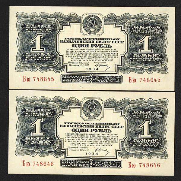 Russia. Lot of 2 sequential notes, 1 Gold Ruble. P-207a. Arms at top center, value at ends. Variety with signature. Bold embossing. Both Choice to Gem Uncirculated. 2 pieces.