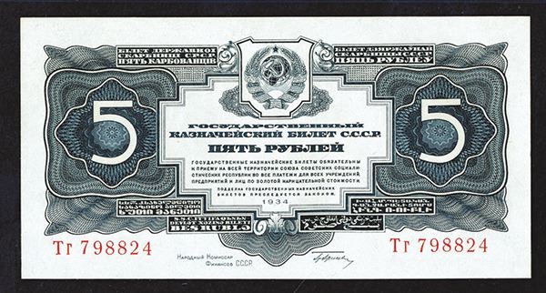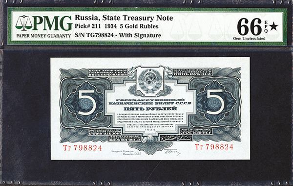 Russia. 1934, 5 Gold Rubles, P-211, Issued banknote, with signatures. black on light blue underprint, S/N TG 798824, PMG graded Gem Uncirculated 66 EPQ* With claims to Superb condition, none grading higher and this note will literally be impossible to improve upon.