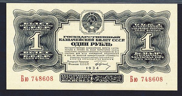 Russia. 1934, 1 Gold Ruble, P-207, Issued banknote, with signatures, black on light orange underprint, S/N's 748608, PMG graded Gem Uncirculated 66 EPQ, Attractive high grade note. Tied for finest known.