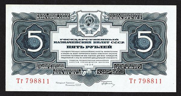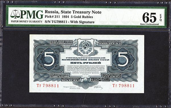 Russia. 1934, 5 Gold Rubles, P-211, Issued banknote, with signatures. black on light blue underprint, S/N TG 798811, PMG graded Choice Uncirculated 65 EPQ, attractive example in high grade with only one note grading higher.