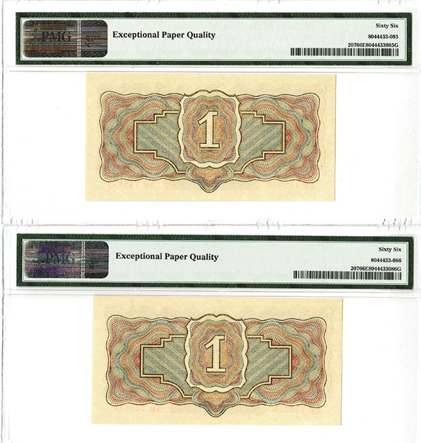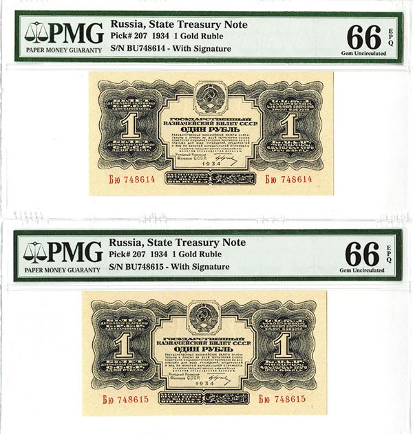 Russia, Sequential Banknote Pair, 1934, 1 Gold Ruble, P-207, Issued banknotes with signatures, dark blue on light peach paper, S/N's BU748614-748615, both are PMG graded Gem Uncirculated 66 EPQ. Amazing high grade pair rarely seen this nice.