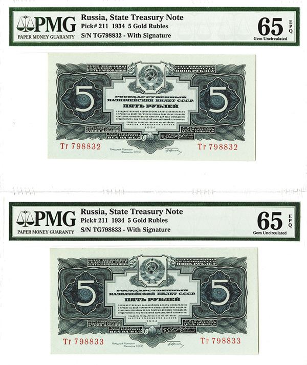 Russia, Sequential Banknote Pair, 1934, 5 Gold Rubles, P-211, Issued banknotes with signatures, Gray blue on light blue paper, S/N's TG798832-798833, both are PMG graded Gem Uncirculated 65 EPQ. Amazing high grade pair rarely seen this nice.