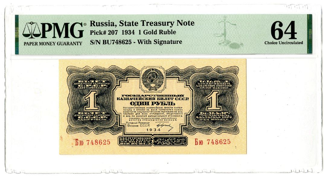 Russia. 1934. 1 Gold Ruble, P-207, Issued banknote, Dark blue face, S/N BU748625 - With Signature, PMG graded Choice Uncirculated 64.