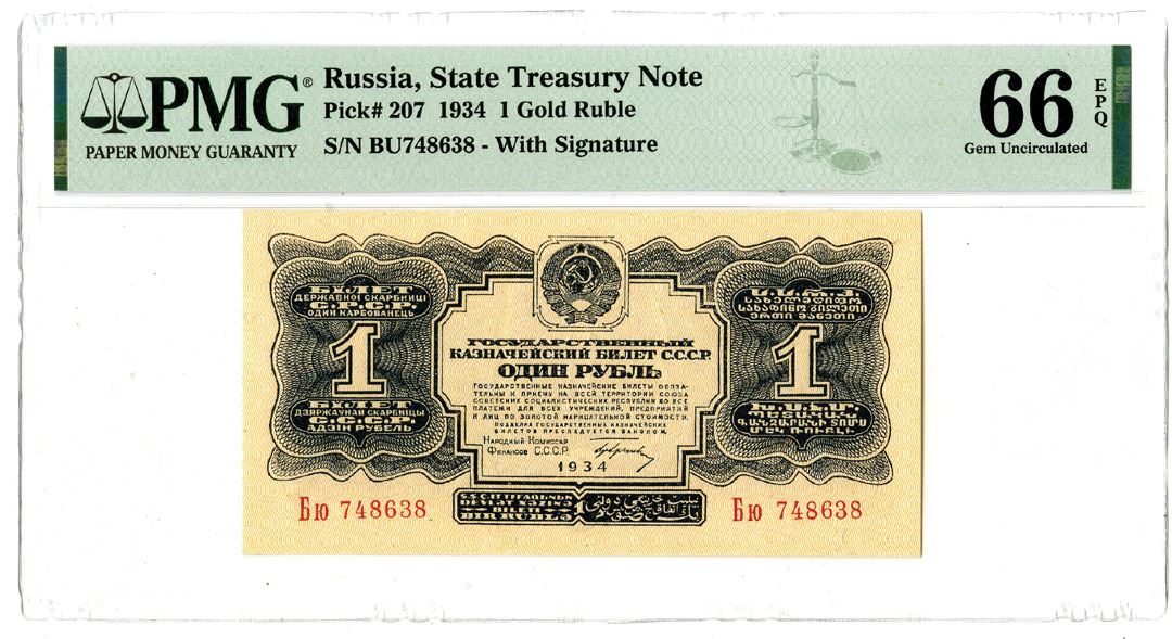 Russia. 1934. 1 Gold Ruble, P-207, Issued banknote, Dark blue face, S/N BU748638 - With Signature, PMG graded Gem Uncirculated 66 EPQ.