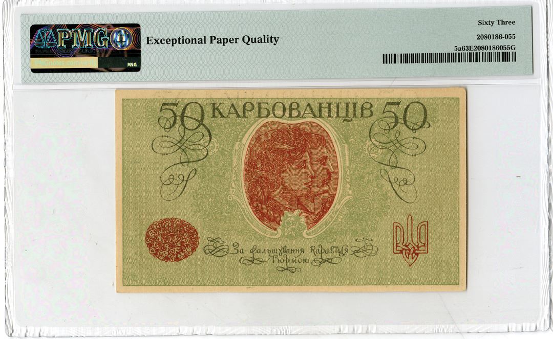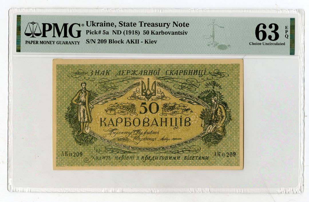 Ukraine. ND (1918). 50 Karbovantsiv, P-5a, Issued banknote, Green on olive underprint, S/N 209 Block AKII - Kiev, PMG graded Choice Uncirculated 63 EPQ. Tied with one other note as highest graded out of 5 graded in the PMG census.