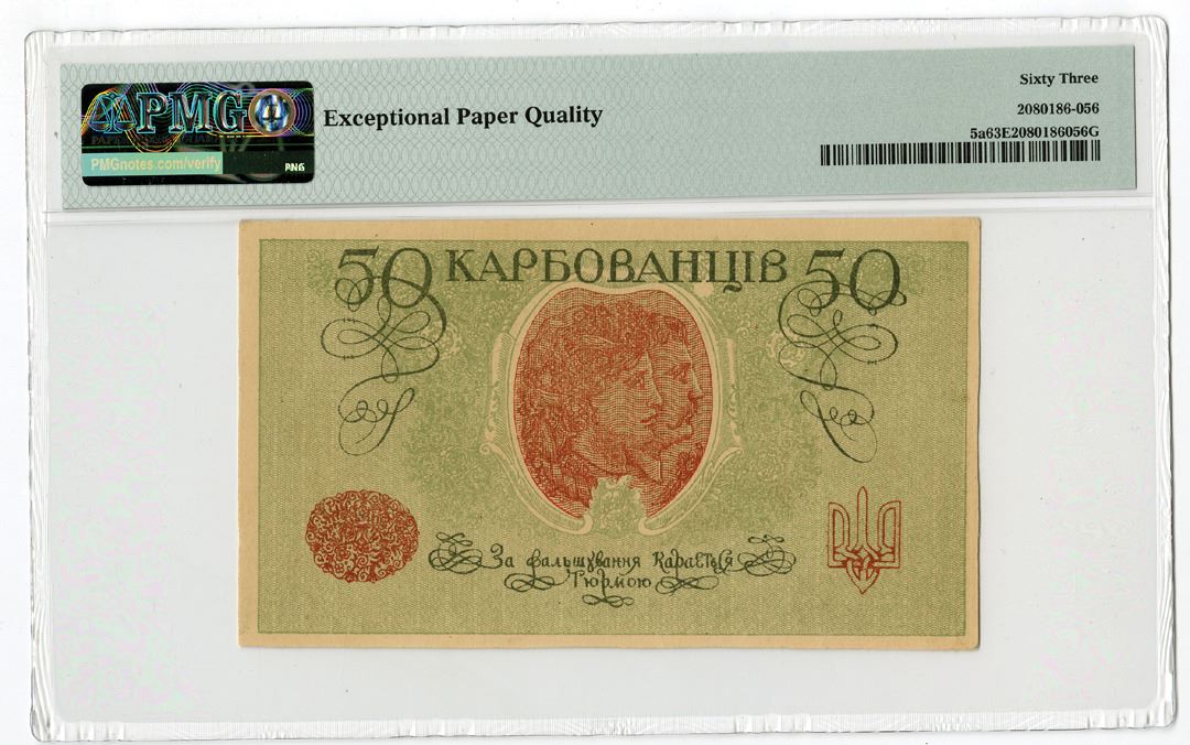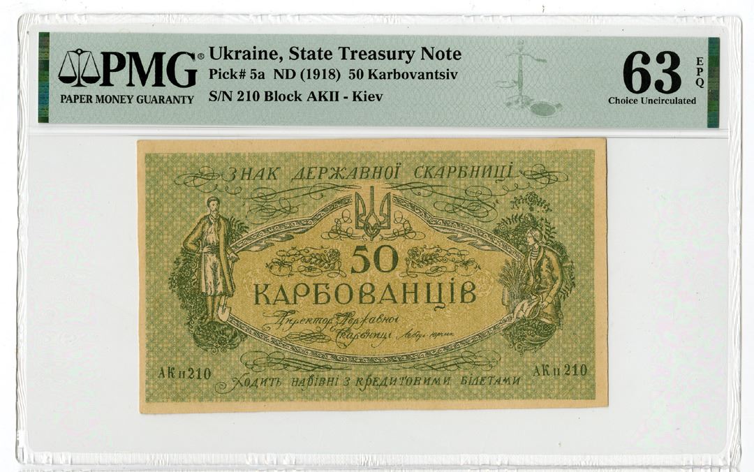 Ukraine. ND (1918). 50 Karbovantsiv, P-5a, Issued banknote, Green on olive underprint, S/N 210 Block AKII - Kiev, PMG graded Choice Uncirculated 63 EPQ. Tied with one other note as highest graded out of 5 graded in the PMG census.