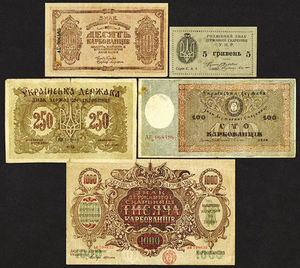 Ukraine, lot includes 1000 Karbovantsiv, P-35; 10 Karbovantsiv, P-36; 100 Karbovantsiv, P-38; 250 Karbovantsiv, P-39; and finally 5 Hyrven, P-41.
