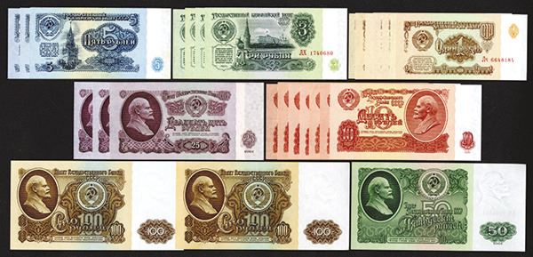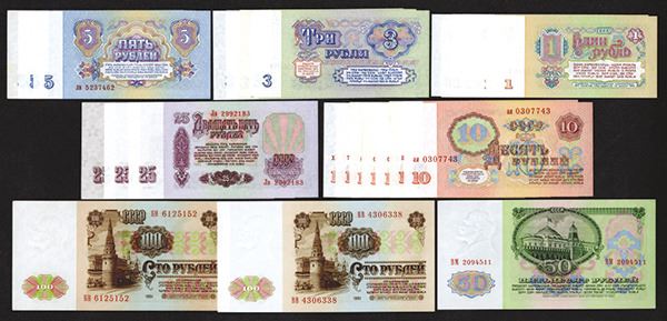 Russia. Treasury Notes: 1, 3, 5 Rubles. State Bank Notes: 10, 25, 50, 100 Rubles. P-222a (7), 223a (4), 224a (3), 233a (7), 234a, b (2), 235a, 236a (2), Many serial # prefixes represented. All a very nicely matched Very Choice Uncirculated. 27 pieces. (Arthur C. Matz Collection).