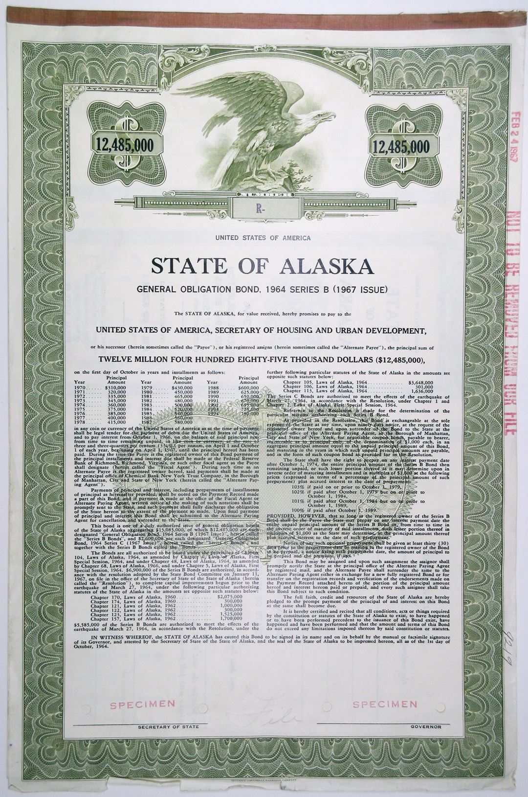 Alaska, October 1, 1964. $12,485,000 Specimen 3 3/4% General Obligation Bond, Black text with olive border and undertint, Eagle at top center. Red specimen overprints, Not to be removed from file stamp at left, POCs. VF condition with damage to bottom margin, SCBN.